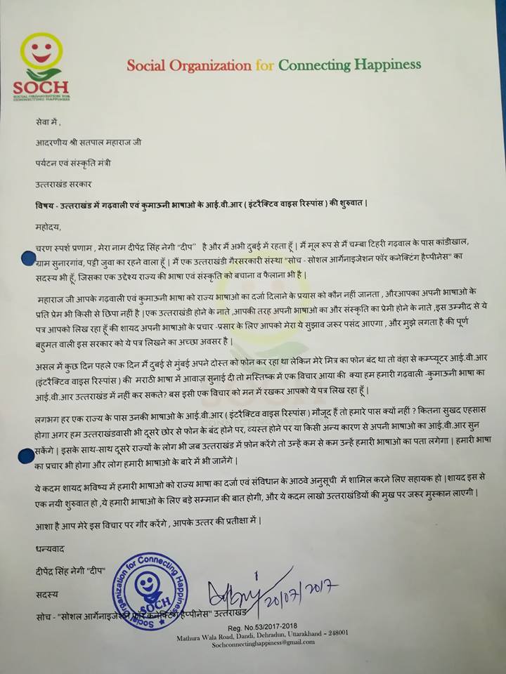 असल में कुछ दिन पहले एक दिन मैं दुबई से मुंबई अपने दोस्त को फोन कर रहा था लेकिन मेरे मित्र का फोन बंद था तो वंहा से कम्प्यूटर आई.वी.आर (इंटरैक्टिव वाइस रिस्पांस ) की मराठी भाषा में आवाज़ सुनाई दी तो मस्तिष्क में एक विचार आया की क्या हम हमारी गढ़वाली –कुमाऊनी भाषा का आई.वी.आर उत्तराखंड में नहीं कर सकते? बस इसी एक विचार को मन में रखकर आपको ये पत्र लिख रहा हूँ |